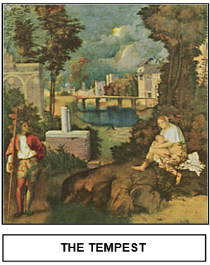 Leonardo da Vinci: Proportions of the Human Figure (Vitruvian Man) – Galleria dell’Accademia, Venice; Ginevra de’Benci – National Gallelry of Art, Washington; Last Supper – Refectory, Santa Maria delle Grazie, Milan; Mona Lisa – The Louvre, Paris; Design for Swing Bridge – Biblioteca Ambrosiana, Milan; View of a Foetus in the Womb – Royal Collection, UK; Design for helicopter – Bibliothèque de l’Institute de France, Paris; Saviour of the World – private collection. Giorgione: The Tempest -