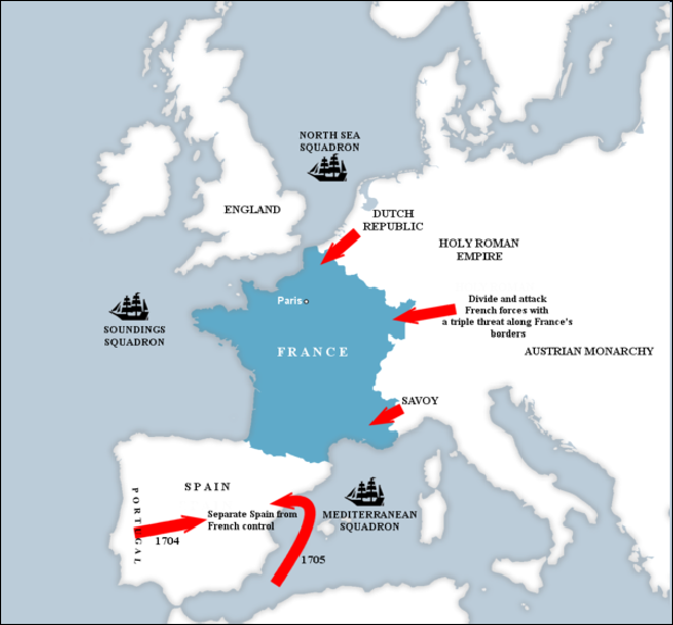 xxxxxIn 1701 Louis entered into his final, longest and bloodiest conflict, the War of the Spanish Succession. By accepting the Spanish crown on behalf of his grandson, following the death of Charles II, he alarmed the rest of Europe by the sheer size and potential power of his family's empire, over-seas as well as at home. A coalition of European powers - another Grand Alliance - was formed and, over the next nine years, as we have seen, this won a series of victories over the French, due mainly to the joint leadership of two outstanding generals, Prince Eugene of Savoy and the English soldier the Duke of Marlborough. The French were not without their success, but the major battles, those of Blenheim, Ramillies, Oudenaarde and Malplaquet, were won by the Allies. After Oudenaarde in 1708, Louis sued for peace, but negotiations dragged on for the next three years, held up by Louis' refusal to turn his army against that of his grandson, the Spanish king, Philip V. It is hardly surprising that Louis should seek an end to the war. As the map above shows, he was up against a formidable alliance in a war he was not likely to win.
