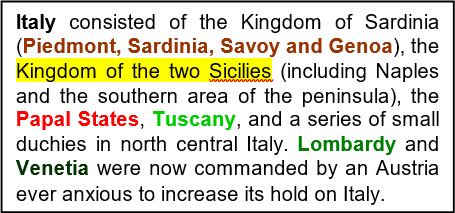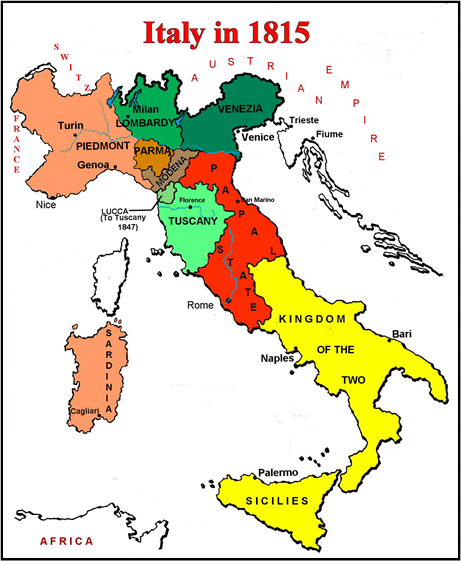 xxxxxThe restoration of the old European order by the Congress of Vienna in 1815 meant that Italy continued to be occupied by foreign troops and dominated by their despotic rulers. Not surprisingly, the repressive regimes imposed upon Lombardy and Venetia by the Austrian leader von Metternich, together with his attempts to expand further his country’s control over the whole of Italy, gave fresh impetus to the Risorgimento, the nationalist movement dedicated to the expulsion of foreigners and the unification of Italy. At first it made little headway. The secret organisation known as the Carbonari - originally formed to overthrow Napoleon’s seizure of Italy - carried out a series of revolts in the 1820s, but these were all unsuccessful, and the Young Italy movement, formed by the ardent republican Giuseppe Mazzini in 1831, fared little better, though it did provide the basis for a national movement.