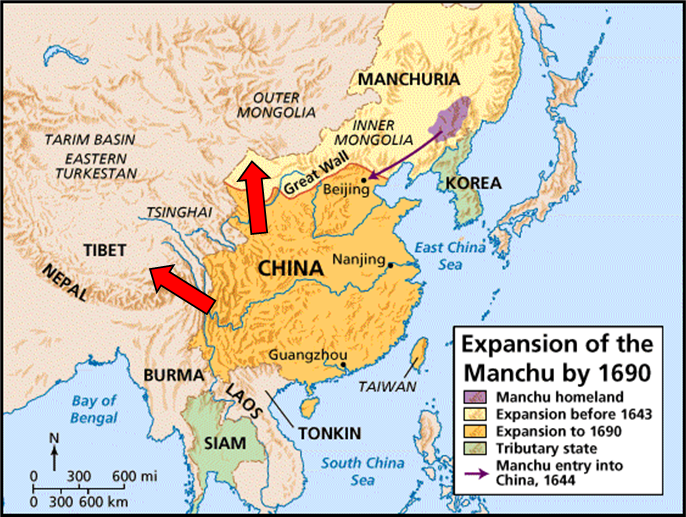 xxxxxK'ang-hsi's final expedition came some twenty years later when the Dzungars again disturbed the peace by invading Tibet and occupying Lhasa. In 1720 he sent his army to expel them (arrowed on map below), and then took the opportunity to incorporate Tibet into his empire. The map below shows the extent of the Manchu dynasty up to 1690. It survived until the declaration of a republic in 1911.