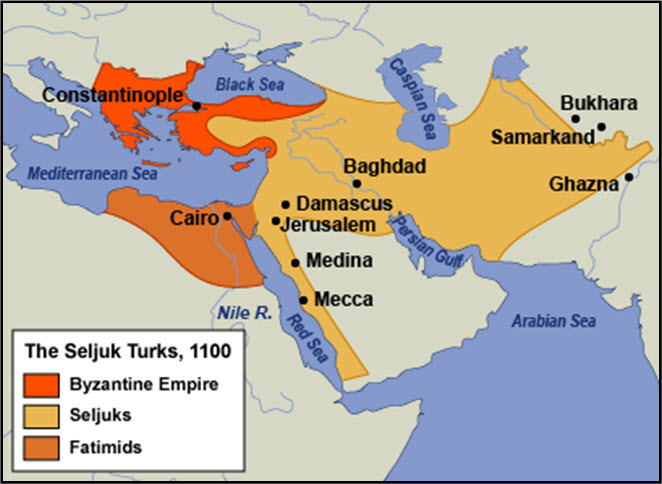 xxxxxThe Seljuk Turks, a nomadic people who, by 1055, had founded a large empire centred on Baghdad, gained a major victory over the Byzantines at the Battle of Manzikert in 1071. This paved the way for their conquest of Anatolia (modern Turkey) and, within the year, the capture of Jerusalem -
