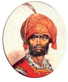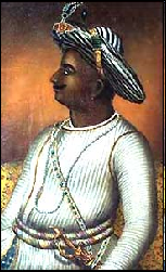 xxxxxThe third and fourth of the Mysore Wars were waged against Hyder Ali's son, the colourful Tippu Sahib (illustrated). In 1792 he was forced to give up half his domains, and then in 1799 (G3b) he was killed when the British stormed and captured his capital Seringapatam and took over control of the state.