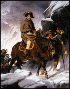 xxxxxIncidentally, shown here is a much more heroic, iconic interpretation of Napoleon’s crossing of the Alps, the work of the outstanding French painter Jacques-