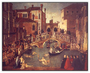xxxxxA good example of this type of work is the one entitled The Miracle of the Cross on San Lorenzo Bridge, illustrated here. This is full of detail and interest, and is infused by a soft, warm light. His paintings, which are straightforward representations of his subject and have little emotional content, often contained portraits of contemporary notables of the city, and this heightened their appeal. Shown below are his Procession in St. Mark’s Square, and St. Mark Preaching in Alexandria.