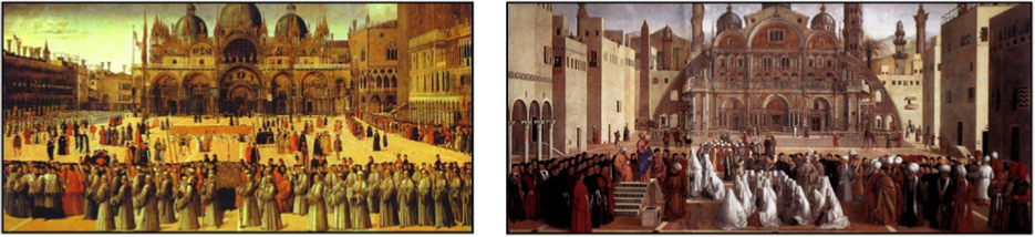 Map (Eastern Mediterranean): by courtesy of author, Esemono – www.wikipedia.org. Gentile Bellini: Portrait of Sultan Mehmed II – National Gallery, London; The Miracle of the Cross on San Lorenzo Bridge - Galleria dell’Accademia, Venice; Procession in St. Mark’s Square - Galleria dell’Accademia, Venice; St. Mark preaching in Alexandria – Pinacoteca di Brera, Milan. Jacopo Bellini: Nativity, drawing – The Louvre, Paris.