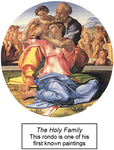 was born in the small village of Caprese, near Arezzo, but his family moved to Florence soon after his birth and it is here that, as a Florentine, he produced some of his finest work. He was apprenticed to the artist Domenico Ghirlandaio at the age of 13, and he quickly showed a natural gift for sculpture and an outstanding talent as a painter. He left after a year's training on the grounds, so we are told, that he had no more to learn! He then worked in the Medici gardens and in the household of Lorenzo the Magnificent. Here he came under the tutelage of the sculptor Bertoldo di Giovanni, and in contact with some of the treasures of classical Roman art. And it was here that he produced, among other works, two relief sculptures -