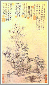 xxxxxOf this time is the Chinese artist Ni Tsan (1301-1374). Known as one of the Four Great Masters of the Yuan Dynasty, he is the most interesting of the group. A quiet, precise artist, he refused to serve the foreign (i.e. Mongol) dynasty of the Yuan, and spent some years as an ascetic, wandering around the countryside, painting as he went. He returned to urban life when the Ming dynasty was founded in 1368. His painting, mostly landscapes, is characterised by a marked simplicity, with but a suggestion of a subject matter and executed in ink monochrome. This unusual style is in stark contrast to the pictorial realism attempted earlier by the artists of the Southern Sung School.
