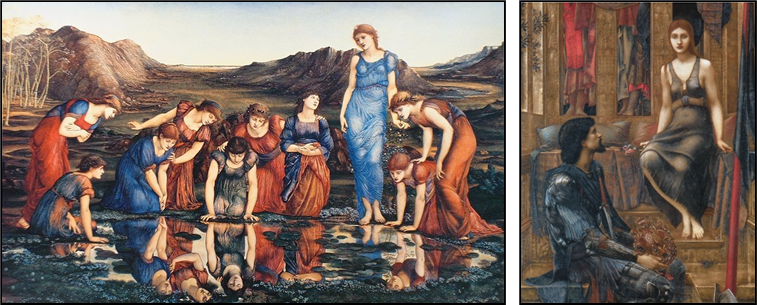 xxxxxThe English Pre-Raphaelite artist Edward Burne-Jones (1833-1898) met Morris at Oxford University and they became life-long friends. He joined Morris’ decorative art company in 1861 and very soon excelled in the making of stained glass windows. His inventive and detailed designs came to be admired in chapels and churches up and down the country. He also assisted in the making of superb tapestries, ceramic tiles and jewellery, and in the 1890s he provided many illustrations for the exquisite volumes designed and printed by Morris’ Kelmscott Press. He gained over night fame as a painter in 1877 when he exhibited eight of his works at the Grosvenor Gallery in London. His highly imaginative, dream-like paintings included The Beguiling of Merlin, The Mirror of Venus and King Cophetua and the Beggar Maid.