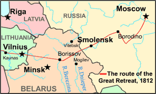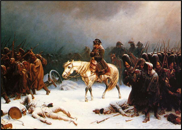 xxxxxThe retreat from Moscow began on the 19th October 1812. It has gone down in history as a military disaster without parallel. Facing the severe winter conditions and constantly harried by Cossacks, it is estimated that some 380,000 men died from the cold or enemy action. Forced to eat their horses because of lack of food, and discarding their guns and equipment en route to make the going lighter, the pathetic remnants of Napoleon’s great army limped westward, reaching the Berezina River at Borissov six weeks later in the last week of November. Here, while a bridge was being constructed, another 24,000 men lost their lives. And many who survived the crossing and eventually reached safety later died of severe frostbite. Despite Napoleon’s subsequent efforts to raise a new army, his nation never recovered from this debacle. There were still some victories to be won, but the tide had finally turned against the all-