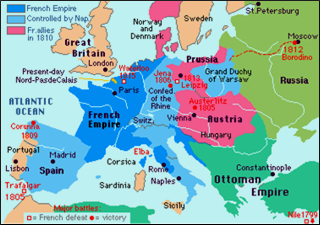 xxxxxThough still involved in the Peninsular War, by 1810 Napoleon appeared to be at the height of his power. The French dominated all of continental Europe by one means or another. In 1812, however, to force Alexander I to comply with the blockade of British shipping and, at the same time, to cut his country down to size, Napoleon took the fatal decision to invade Russia and occupy Moscow. He reached the capital in October after a narrow victory at the Battle of Borodino, but Alexander would not negotiate, and Napoleon’s vast army was forced to retreat. By then winter had set in, and the harsh weather conditions, together with constant attacks by Cossacks, almost destroyed the French army. It is estimated that 350,000 lost their lives. This disaster encouraged European nations such as Austria and Prussia to seek their independence. Surprisingly, the following year Napoleon, having formed a new army, won the Battles of Lutzen and Bautzen against Russia and Prussia, but, as we shall see, he lost to the allies at the Battle of Leipzig in October 1813, and this appeared to mark the end of his fighting career.