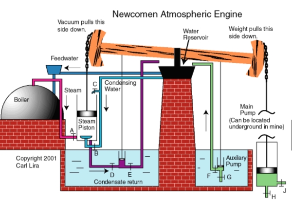 Diagram: by courtesy of Carl Lira – one of Newcomen’s early engines, dated around 1725, can be seen in Newcomen’s Engine House, Dartmouth, Devon.