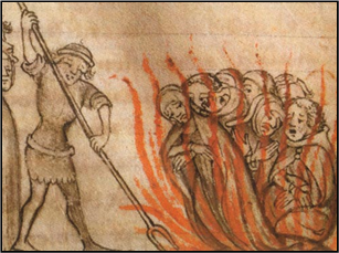 Knights: date and artist unknown. Burning at Stake: artist unknown, from an anonymous chronicle entitled From the Creation of the World until 1384 – Municipal Library, Besançon, Eastern France.