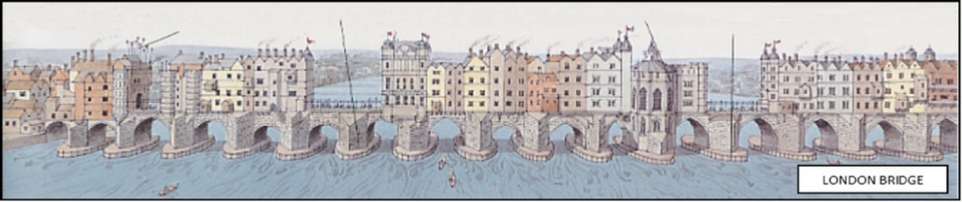 The first London Bridge to be made of stone was also built about this time. It was designed by Peter of Colechurch who, having completed the last timber bridge across the Thames in 1163, started this ambitious new project in 1176. Because of the swift flowing current, great difficulty was encountered in laying the foundations for the piers, but the problems were eventually overcome. When completed, the bridge supported a street which was wide enough to have shops and houses on both sides. In addition it had a built-