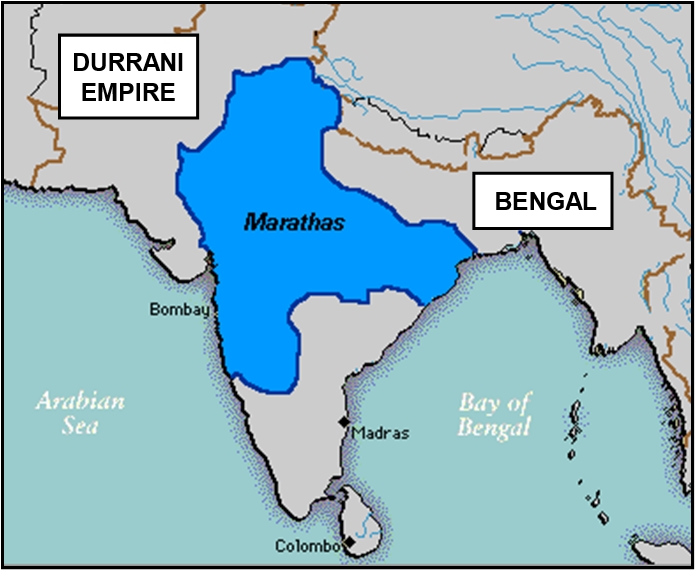 xxxxxThe Maratha state was founded by Shivaji in 1674. With the death of Aurangzeb in 1707 and the decline of the Mughal Empire, the Maratha slowly gained control of much of central and northern India. Meanwhile, however, as we have seen, following the death of the Iranian leader Nadir Shah in 1747 (G2), his chief bodyguard, Ahmad Shah Durrani, was elected king of Afghanistan and led attacks into northern India. In 1761 he met up with the Maratha army and destroyed it at the Battle of Panipat. This shattered their dream of succeeding the Mughals as rulers of India but, as we shall see, in 1775 they met with some success in the first of the Anglo-