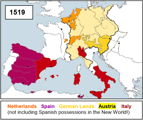 xxxxxAs we shall see, Charles, eventually worn out by the cares of his great office, abdicated in 1556 (M1) and gave away his vast territories to his son Philip and his brother Ferdinand. He then retired to a monastery for some peace and quiet!