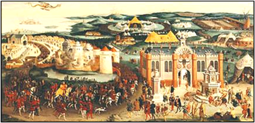 xxxxxAt home, Francis I became an ardent persecutor of the Huguenots (French Protestants) from 1534 onwards, and his reforms in government, principally to raise funds, created tension between the traditional nobility and a new ruling class of administrators. As an “enlightened” autocrat, he was anxious to give status to his Court, and determined to retain complete control of his domain. At the same time, he employed Italian artists, including Leonardo da Vinci, to embellish his chateaux and palaces. He built the castles at Chambord and Fontainbleau, and was responsible for the creation of a royal library, the beginnings of the Collège de France. As we have seen, one of the most lavish events of his reign was his meeting with the English King Henry VIII, held on “The Field of the Cloth of Gold” near Calais in 1520 (here illustrated).