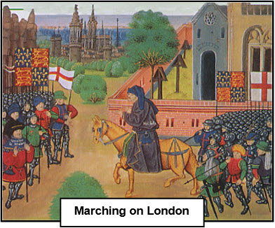 Marching on London: 15th century manuscript from the Froissart Chronicles, artist unknown – British Library, London. Death of Wat Tyler: 15th century manuscript from the Froissart Chronicles, artist unknown – British Library, London.