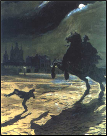 xxxxxBy now, these works had gained him a wide popularity and, in recognition of this, Tsar Nicholas I pardoned him, allowed him to return to Moscow in 1826, and even promised some reforms. However, relations with the government remained strained, to say the least, though he was able to continue his writing. Here he made further calls on Russian history with his two long poems Poltava of 1828 and The Bronze Horseman five years later, a telling tale in which society’s powerless “little man” is chased through the streets by the statue of the all-and in 1837, having to fight a duel with his brother-