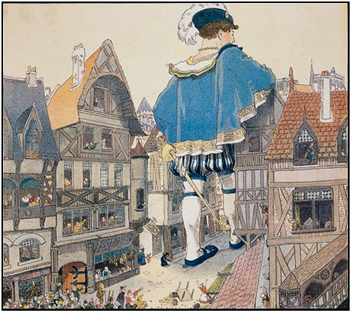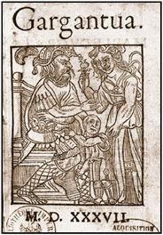 Rabelais: 17th century, artist unknown – National Museum, Palace of Versailles, France. Gargantua: illustration by the engraver Adrian Leroy for the 1913 edition of The Inestimable Life of the Great Gargantua – National Library of France, Paris.
