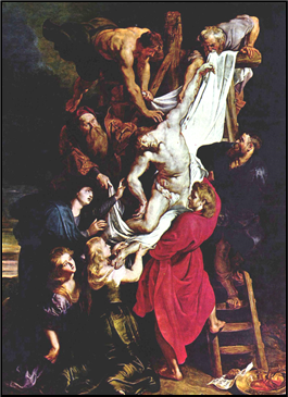 xxxxxAnd it was while travelling in Italy that the works of Titian, Veronese and Tintoretto in Venice, and those of Michelangelo and Raphael in Rome, had a profound effect upon his future style. No sooner had he returned to Antwerp in 1609 than he was appointed painter to the court of the Archduke Albert and the Infanta Isabella, the Spanish Habsburg regents in Flanders. From then on his career took off. Over the next ten years or so he produced some magnificent religious compositions for the Cathedral and the Jesuit Church in Antwerp. Works in this period included his Massacre of the Innocents and two magnificent altarpieces, The Raising of the Cross and The Descent from the Cross (illustrated), painted in 1611. In his Christ on the Cross, he uses dramatic lighting and swirling lines to create an extraordinary sense of movement. This series of paintings brought him international fame and commissions from all over Europe.