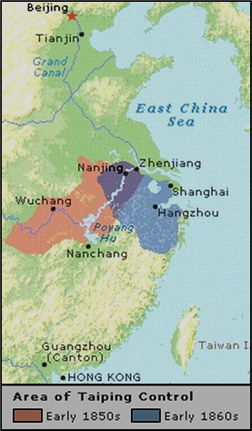 xxxxxThe Taiping Rebellion, which, as we have seen, began in 1850 and plunged China into years of savage warfare, was a violent peasant revolt triggered off by two years of famine. Over the next fourteen years the country was racked by a religious and political crusade which raged over seventeen provinces and took the lives of some twenty million people. Its leader, a Cantonese schoolmaster named Hong Xiuquan, claiming to be the younger brother of Jesus Christ with a mission to save China, quickly won over the support of Christianized communities, and, promising the equal distribution of land and full equality for women, attracted vast numbers of impoverished peasants and low paid industrial workers. The uprising began in the southern province of Kwangsi, and by 1853 the rebels had swept through south-east China, advanced along the Yangtze valley, and seized Nanjing. This city was made the capital of the “Heavenly Kingdom of Peace” (the meaning of Taiping), and Hong was proclaimed its “Heavenly King”. Over the next few years the rebel army become a formidable force (about one million strong), strongholds were established in the north and south, and a loose form of government was established based on communist lines.