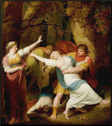 xxxxxThe production of his plays began about 1589, though it is clear that for five or six years after this date he was experimenting with the order of construction and still learning the basic techniques of his trade. At this time, his blank verse was somewhat stultified, and the action was restricted to the one and only theme. To this period belong the plays Henry VI and Richard III, the weak and/or evil leadership of these monarchs designed to contrast with the upright rule of the Tudor dynasty. Among his comedies are the boisterous farces The Comedy of Errors and The Taming of the Shrew, and Love's Labour's Lost, a play that pokes fun at the pretensions of aristocratic society. Also produced at this time was Titus Andronicus (here illustrated), a bloody revenge tragedy, based upon the style of the Roman dramatist Seneca, and clearly influenced by the work of the contemporary dramatist Thomas Kyd.