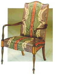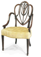 xxxxxThe English cabinetmaker and designer George Hepplewhite (c1727-1786) learnt his trade in Lancaster. He set up his workshop in Redcross Street, London in 1760 (thirty years before Sheraton arrived in the capital), but his name did not become well known until 1788, two years after his death. It was in that year that his Cabinet-maker and Upholsterer's Guide was published, providing a catalogue of neo-classical designs aimed to improve the style and serviceability of ordinary household furniture. Its 300 plates illustrated a wide variety of elegant, graceful pieces, all strongly constructed, and many attractively inlaid and decorated with the classical motifs and floral designs then being introduced into furnishing by the talented English interior designer Robert Adam. Featuring prominently among these designs were the Hepplewhite chairs, distinctive by their slender frame, their inlaid or painted decoration, and their heart, shield or oval shaped backs.