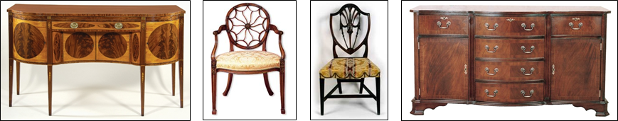 The English cabinetmaker and designer George Hepplewhite (c1727-1786) set up business in London in 1760 (thirty years before Sheraton arrived in the capital), but it was not until 1788, two years after his death, that he gained fame with the publication of his Cabinetmaker and Upholsterer’s Guide. This provided a catalogue of neo-classical designs aimed at improving the quality and style of household furniture. Much of his work was decorated with classical motifs and floral designs - features then being used by the English interior designer Robert Adam - and he became particularly well-known for his chairs, distinctive by their slender frames and their heart, shield or oval shaped backs. Like Sheraton, his illustrated catalogue greatly influenced both British and American furniture designers well into the next century.