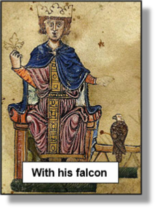 Frederick II: manuscript from his book The Art of Hunting with Birds – Vatican Library, Rome. Map (Europe): licensed under Creative Commons – 72middleagesfour.wikispaces.com.