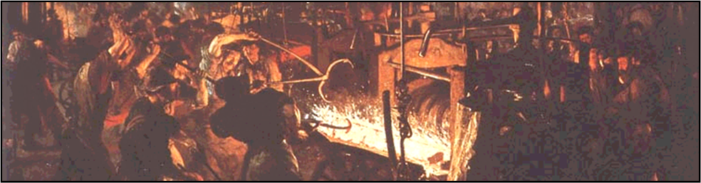 xxxxxAs we have seen, in the continuing saga of the Industrial Revolution, Henry Cort’s puddling process in the making of iron, introduced in 1784 (G3b), together with Edmund Cartwright’s wool combing machine and Eli Whitney’s cotton gin, gave fresh impetus to their respective industries. At the same time an improved network of roads and canals, the achievement of men like James Brindley, Thomas Telford and John McAdam, meant that goods and raw materials could be more easily moved about the country. In the 1820s this transport system received an enormous boost with the beginning of the railways, due in large measure to the engineering genius George Stephenson, improving on the work of James Watt and Richard Trevithick. And the building of the locomotives and the rail road itself were made possible by the continuing advances in the iron industry. The Scottish engineers James Neilson and James Nasmyth, for example, invented the hot air blast and the steam hammer respectively, and, as we shall see, in 1856 (Va) the Bessemer process mass produced steel more efficiently and cheaply. In the meantime, however, the mass migration of people from country to towns caused many social problems, and a cry for political reform. The next decade was to see the Reform Act of 1832, the Poor Law of 1834 and a struggle for workers’ rights, exemplified by the Tolpuddle Martyrs of 1834 and the Chartist movement of 1838. By this time the Industrial Revolution was spreading over Europe and the United States, and was to reach Japan soon after the turn of the century.