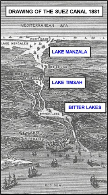 xxxxxThe artificial waterway, just over 100 miles long and located at the crossroads of Europe, Africa and Asia, was planned to run from Port Said on the Mediterranean Sea to the Gulf of Suez in the south, thereby avoiding the journey around the Cape of Good Hope and cutting the distance from London to Bombay, for example, by no less than 42 per cent. The route followed a straight line, using three bodies of water, Lake Manzala, Lake Timsah and the Bitter Lakes (see map above), and, apart from the lakes, several passing bays were provided. The low lying Nile delta was situated to the west and a higher, desert area -