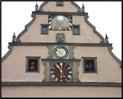 xxxxxIncidentally, a story is told - probably a true one - about the Bavarian commander Count Graf von Tilly, the brilliant leader of the Catholic League during the first fourteen years of the war. A man who was hardly known for his leniency - he was later dubbed "the butcher of Magdeburg" - Tilly captured the fortress of Rothenburg in 1631 and, doubtless as a peace-offering, was presented with a large flagon of the district's best wine. He then declared that he would spare the town and its inhabitants if one of its citizens could drink the entire amount - almost a gallon - at one gulp. The mayor, one George Nusch, accepted the challenge and won it. The town clock depicts this heroic deed each time it strikes the hour, and the event is commemorated every Whitsuntide by the performance of a play, aptly called Der Meistertrunk - The Master Gulp. It appears that it took the mayor several days to recover!