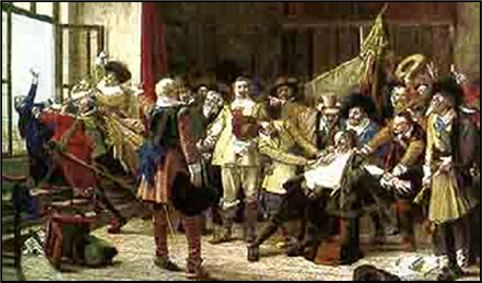 xxxxxThe Thirty Years’ War - a series of conflicts - began in Germany as a fight between Protestant and Catholics, but gradually developed into a struggle over the control of Germany itself, pulling in countries from all over Europe. German principalities fought against each other, whilst outside countries, like France and Sweden, saw it as a chance to curb the power of the ruling Austrian Habsburgs. In the long term, the Peace of Augsburg of 1555 (M1), an attempt at a religious compromise, had only served to inflame the differences between the Protestants - mainly in the north - and the Catholics, mainly in the south. The spark which ignited the conflict occurred in May 1618 when Protestants in Prague seized two of the king’s Catholic ministers and threw them out of an upstairs window (an event known as the “Defenestration of Prague”). At first the Protestants carried all before them, but in 1620 they were soundly defeated at the Battle of White Mountain, and their fortunes slumped. By 1624 Bohemia, the epicentre of the Protestant cause, had been forcibly returned to the Catholic faith. The devastation and misery caused by the war was immense but, as we shall see (1625 C1), worse was to come as other countries became evolved in the conflict.