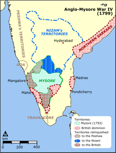 xxxxxIt was a bitter pill for Tippu to swallow, but worse was to come. Later, the British were informed that Tippu had made overtures to the French, entertained envoys from the republican government, and even planted a tree of liberty at his capital Seringapatam! At that time the Revolutionary Wars in Europe were at their height. It only needed the slightest suspicion of French involvement in the affairs of India to provide an excuse for action against an enemy which, in any case, was hostile and needed to be curbed. The governor-