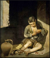 xxxxxApart from his religious themes, he was a fine genre painter. Indeed, today he is best remembered for his sympathetic depiction of street urchins, such as The Melon Eaters, Two Peasant Boys and his Young Beggar (illustrated left), the last named completed in 1655 and now in the Louvre, Paris. Illustrated on the right is his Old Woman with a Hen. These works are rightly admired for their human warmth and the realistic rendering of the still-