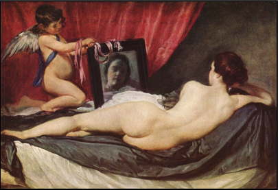 xxxxxIt is known that Velasquez painted a number of female nudes, but the lovely Rokeby Venus (illustrated) is the only one which has survived. More's the pity. Clearly inspired by the Venetian artist Titian, this work of natural beauty was painted for a Spanish nobleman, but later came into the possession of the Morritt family from Rokeby in Yorkshire, hence its name. It can now be seen in the National Gallery, London. In 1914 a suffragette visited the Gallery and badly damaged the Rokeby Venus, slashing it with a knife. It was expertly repaired, but if one examines the painting carefully the marks of the attack can still be seen.
