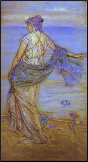 xxxxxIn a long and eventful career, Whistler aroused a great deal of public interest on account of his eccentricity and his artistic arrogance. Wilde once commented that Whistler always spelt art with a capital “I”. His outrageous, unconventional behaviour apart, however, he showed extreme technical proficiency as an artist, and his defence of aesthetic values, based on simple form and harmonious, muted colours, made him a pioneer in the development of abstract art. He also excelled in lithographs, pastels and watercolours, and his etchings place him among the world’s greatest artists in this medium. The pastel shown here is entitled Annabel Lee.