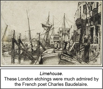xxxxxDespite efforts to avoid the inevitable, Whistler was declared bankrupt in 1879, and took himself off to Venice with his mistress, Maud Franklin There, over a period of fourteen months, he produced 50 meticulously drawn etchings and over 90 pastels of local scenes. On his return to London, these works, together with the publication of sets of etchings produced earlier in London, France and Amsterdam, helped to provide an income, and went some way to restoring his reputation. By the early 1880s he had regained his position as one of the most colourful characters in London society, and, influenced by the 19th century painter Camille Corot, had turned to the painting of small seascapes in oil and water colour.
