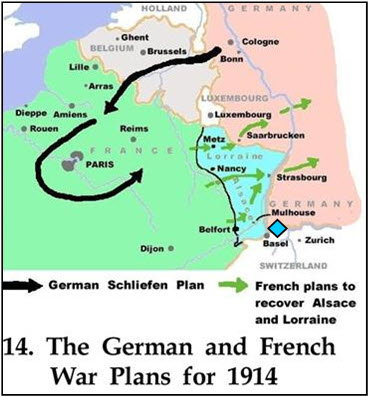 In their battle for Alsace and Lorraine what could be seen as a defeat for the French was to prove something of a victory …. in hindsight. Letting the French armies advance into the two provinces had been, in fact, part of German strategy. The further the French moved eastward in the disputed territories, the further would their valuable contribution be removed from Germany’s speedy advance through Belgium and France in the north-