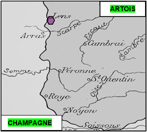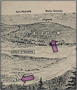 Battle of Artois, fought from the 17th December to the 13th January 1915, the French Tenth Army failed to gain their prime objectives, hampered as they were by the lack of heavy artillery and the conditions under foot. Winter rains had set in and the ground was muddy and very treacherous. The immediate aim was to take the strongly fortified town of Carency and then go on to capture Mont de Lorette (see sketch maps), but the German defences proved far too powerful and the resistance far too persistent. With casualties mounting (put at over 7,700 killed and wounded), the offensive was abandoned. At one stage (18th to the 22nd December), the British took on the Germans at Givenchy in the Pas de Calais in order to support their ally, but, hard-
