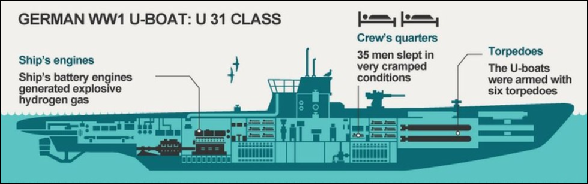 In these battles on the high seas the Germans had their share of success, but they had to proceed with caution, ever conscious of their inferiority in numbers. Despite this drawback however, they had a substantial technological lead in various types of naval equipment, such as magazine protection, range-finding, and – particularly important – the torpedo and the mine. These two items in particular were put to good use. Being anxious to blockade their enemy and bring them to their knees by a war of attrition, the Germans saw it best to pass this task over to the well-proven mine and the submarine, a fairly new weapon in naval warfare (and one, it must be said, with a somewhat disappointing record). In fact, however, the German U-boat (Unterseeboot), though untried in battle and very much in its infancy with regard to its mechanical efficiency and tactical role, proved highly successful. Together with the mine, they caused the Allies deep concern, particularly Great Britian, a country that was very far from being self-sufficent, and was thus very dependent upon the import of food stuffs and raw material. Indeed, had it not been for the introduction of the convoy system in May 1917, Britain might well have been forced to consider some form of peace settlement.