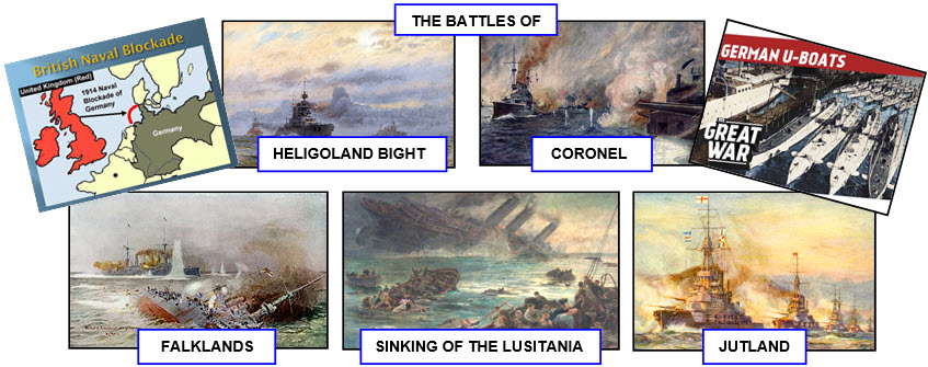 Blockade: Sutori.com Heligoland: britishbattle.com. by German war artiest Willie Stöwer Coronel: commons.wikimedia.org, artist unknown. Uboats: youtube Falklands: en.wikipedia.org, by English war artist William Lionel Wylie Lusitania: Art Uk, y Gaer Museum, Art Gallery & Library, by the British artist Thomas Marie Madawaska Henry Jutland: naval-encyclopedia.com, artisit unknown U-Boat: bbc.co.uk Heading: youtube.com