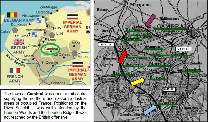 The combined infantry and tank attack, together with strong air support, began on the 20th November and, over a six mile frontage, thrust through the Hindenburg line in three places (see map below). In the north, having swept through Havrincourt, Flesquières (a German stronghold), and Graincourt, the village of Moeuvres was captured, together with Bourlon Woods. By the end of the second day, the outskirts of Bourlon Ridge had been reached, a height overlooking Cambrai itself. In the centre, after the British had succeeded in capturing Ribecourt and the important town of Marcoing, cavalry units were sent to exploit the break through, but they were repulsed at Novelles. Meanwhile, in the south, La Vacquerie was seized, and there was a swift advance to Masnières. Here, however, the canal bridge had collapsed under the weight of a tank. This held up the British advance and, ominously, gave time for the Germans to bring up reinforcements.