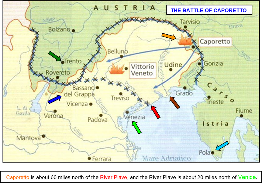 On the 24th October, this sizeable, combined force, commanded by the German General Otto von Below, crossed over the River Isonzo via the two Austro-Hungarian bridgeheads in the mountainous northern sector of the Isonzo front, close to the small town of Caporetto (now Kobarid, in Slovenia). After a ferocious four hour bombardment – including a gas attack – a dawn assault in heavy rain and fog (fifteen divisions strong), literally fell upon Italy’s weary, demoralized, and poorly equipped troops. Infiltrated by stormtroopers armed with flame-throwers and light machine guns (a tactic introduced, as we have seen, in the Battle of Riga a little earlier), the Italian frontline forces virtually collapsed. And no help was available. There were only a few reserve forces in the area, and those that were in-situ were not conveniently deployed. By the evening, the Italians had fallen back 12 miles. The next day Cadorna, who had been convinced, in fact, that the main assault would come in the Trentino region (see map above), was obliged to order a general withdrawal, and his army (originally 41 divisions strong), made a humiliating and disorderly retreat. The Battle of Caporetto - the last Battle of the Isonzo River – and the only offensive of the twelve to be mounted by the Central Powers! – was, indeed, an outstanding defeat, a rout in fact, of the Italian forces. Some units, it must be said, did put up a fight, and an attempt was made to make a stand at the River Tagliamento, but on the 2nd November the Germans crossed it in a number of places, and the Italians were pushed further back, unable to regroup until they had crossed the River Piave (see map above). Here they were joined by the 3rd Army, responsible for the defence of the lower reaches of the Isonzo. It had been forced to move south to avoid the risk of being totally outflanked.