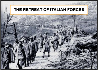 When the battle eventually came to an end in late November, the Italians had lost 7,700 square miles of territory, including the entire province of Friuli and much of Veneto Province. And the displaced population this caused – put at 400,000 - presented an enormous refugee problem for the Italian government. The Second Army, which had taken the brunt of the attack, had lost 40,000 men killed or wounded; some 280,000 had been taken prisoner; and around 350,000 had deserted. Overall, the Italian army was reduced in size by a half, from 65 to 33 infantry divisions. In addition, a vast amount of vital equipment was lost (notably artillery pieces and machine guns), together with food, munitions and medical supplies.
