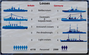 The German navy lost eleven ships, including a battleship and a battle cruiser, and a number of its ships were badly damaged. Casualties amounted to some 2,500. The British sustained heavier loses, fourteen ships in total, including three battle cruisers, and with casualties put at 6,110. On paper, it was a German victory, and it was seen as such by press and public. In Germany, there was much rejoicing, and the Kaiser boasted that “the spell of Trafalgar is broken”. In Britain, of course, there was bitter disappointment at the poor showing of the most powerful navy in the world. But, from a strategic point of view, whilst the Royal Navy lost more ships and more men, it retained its dominance in the North Sea, and was able to continue the blockade, a major contribution to Germany’s eventual defeat. On June 2nd the Grand Fleet was ready for action, but the German High Seas Fleet spent many months repairing its