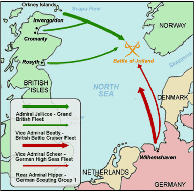 In essence, it was a German attempt to ease if not eradicate the British trade blockade of material and food which was slowly but surely crippling the German Empire. The plan was to lure out the British Battlecruiser Squadron (stationed at Rosyth under the command of Admiral Sir David Beatty), put it out of action, and then take on and defeat the larger part of the British Grand Fleet (commanded by Admiral Sir John Jellico), when – summoned to assist – it arrived from its distant base in the Orkney Islands (see map below). It was a highly ambitious scheme as it stood, but it was made the more perilous by the fact that, unknown to the Germans, the British had been warned by their codebreakers that the operation was in the offing, thereby ensuring that, when the trap was about to be sprung, Jellico’s force would already be well on its way to the battle zone. Combined, the two British forces would number 151 ships compared with the 99 available to the Germans. This said, the German High Seas Fleet was no mean force, comprising 24 battleships, 5 battle cruisers, 11 light cruisers and 63 destroyers.