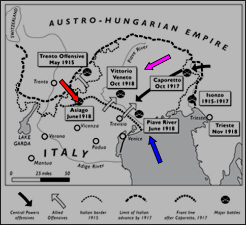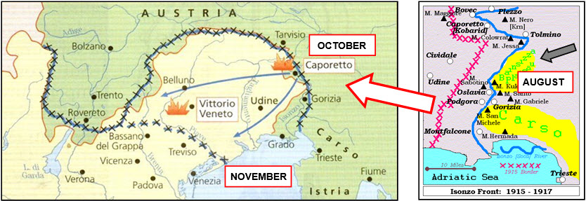As we shall see, it was in October 1918 that the final conflict on the Italian Front, the Battle of Vittorio Veneto (see map above) took place. Not surprisingly, it marked the end of the Austro-