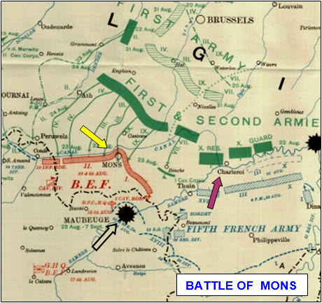 On arriving in France the British Expeditionary Force settled at Maubeuge, close to the Belgian Frontier and it was there, to their right, that they joined up with the French Fifth Army on the Sambre River (see map above). The French were soon hard pressed, however, and to strengthen their left flank the British moved forward to the town of Mons to defend the Condé-