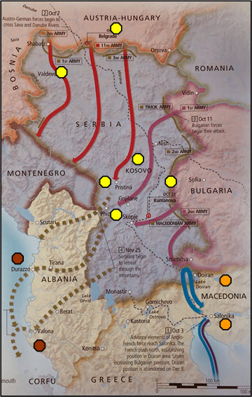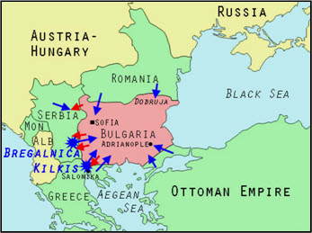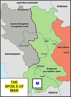 For the Bulgarians, their assistance in the invasion of Serbia was a diplomatic and military triumph. It was the unfinished business of the two Baltic Wars of 1912/13. Serbia had been defeated and humilated; they had gained control of Macedonia, their causus belli (see map on right); the ambitious Romanians had been kept within their borders (for the time being!); and the Central Powers now had the opportunity to establish a valuable rail link – the “Via Militaire” – between Germany and Istanbul. And for their part, Austria-